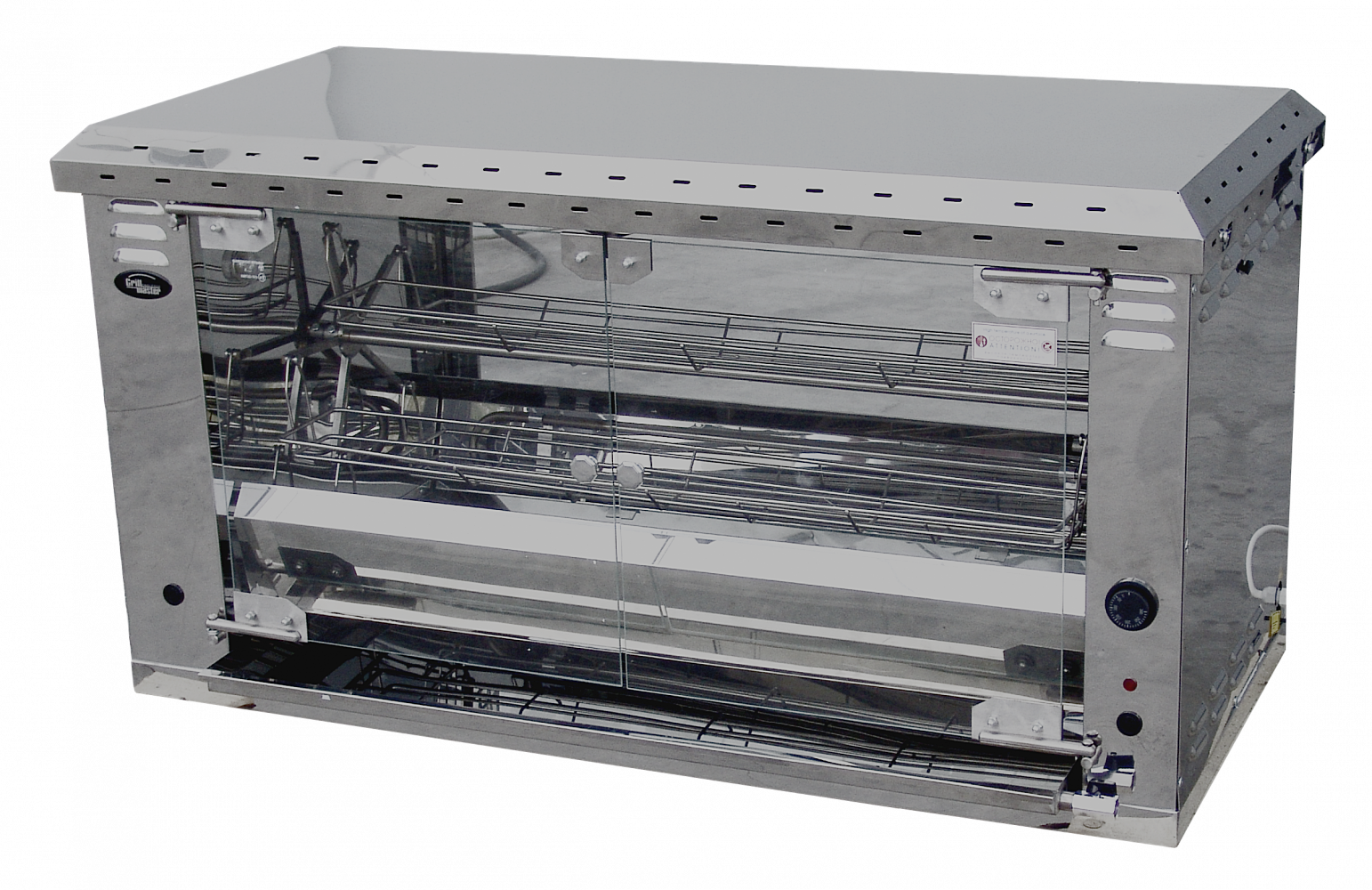 Гриль на 30 тушек, 5 корзин для куриц или субпродуктов, 3 мощных ТЭНа, итальянский мотор-редуктор, подсветка в камере, стеклянные двери и задняя стенка гриля, регулировка температуры с помощью термостата 50-320 С, выполнен полностью из нержавеющей стали