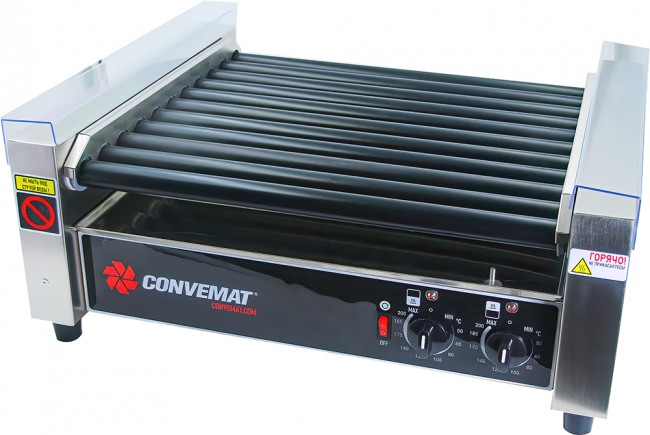 Большой роликовый гриль с тефлоновым покрытием роликов, 11 роликов с полезной шириной рабочей зоны 470 мм., с двумя независимыми зонами нагрева общей мощностью 1650 Вт. и плавной раздельной регулировкой температуры до 200°C. Роликовый гриль для сосисок оснащен магнитными боковыми ограничителями для защиты от стекания жира по внутренним бортам. Качественная компонентная основа, терморегуляторы с тактильным ответом, корпус и ТЭНы из нержавеющей стали, и продуманная конструкция, обеспечат долгие годы службы роликового гриля на фудкорте, АЗС или в круглосуточном магазине.