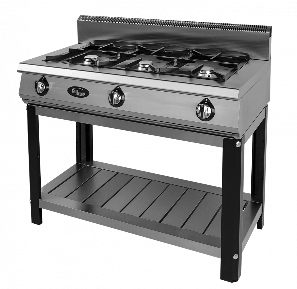 3 профессиональных горелки класса Heavy Duty, газовая мощность 19,5 kW, газконтроль, разборная подставка с нейтрайльной полкой из нержавеющей стали, г.нетто 1120х600х1050, 61кг, г.брутто: 1220х750х1200, 86кг.
