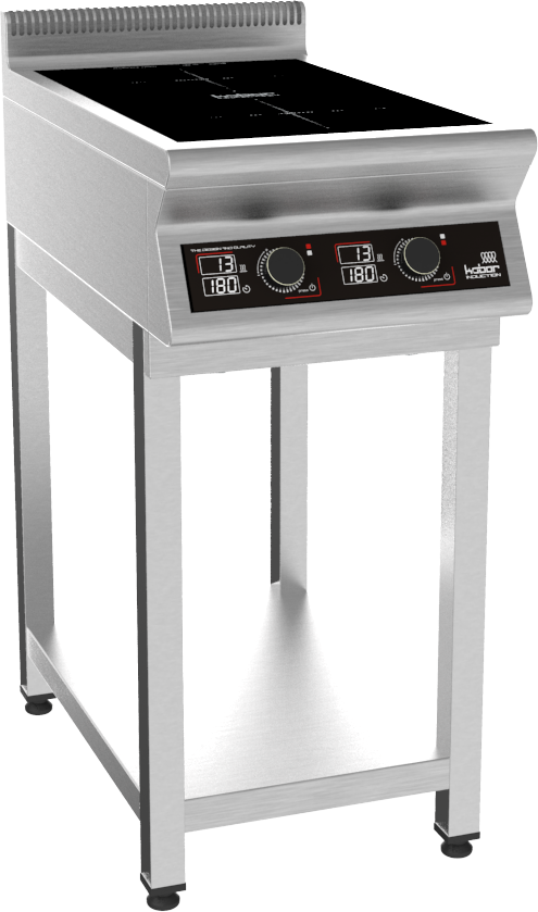Плита индукционная на открытой подставке, 2 конфорки мощностью 2х3,5кВт, электронная панель управления с цифровой индикацией, 13 уровней нагрева, таймер до 180мин., съемный жировой фильтр, корпус из н.с. AISI 304, регулируемые по высоте ножки, рабочая поверхность - стеклокерамика 6мм, 7 кВт, 220В, вес 30 кг.