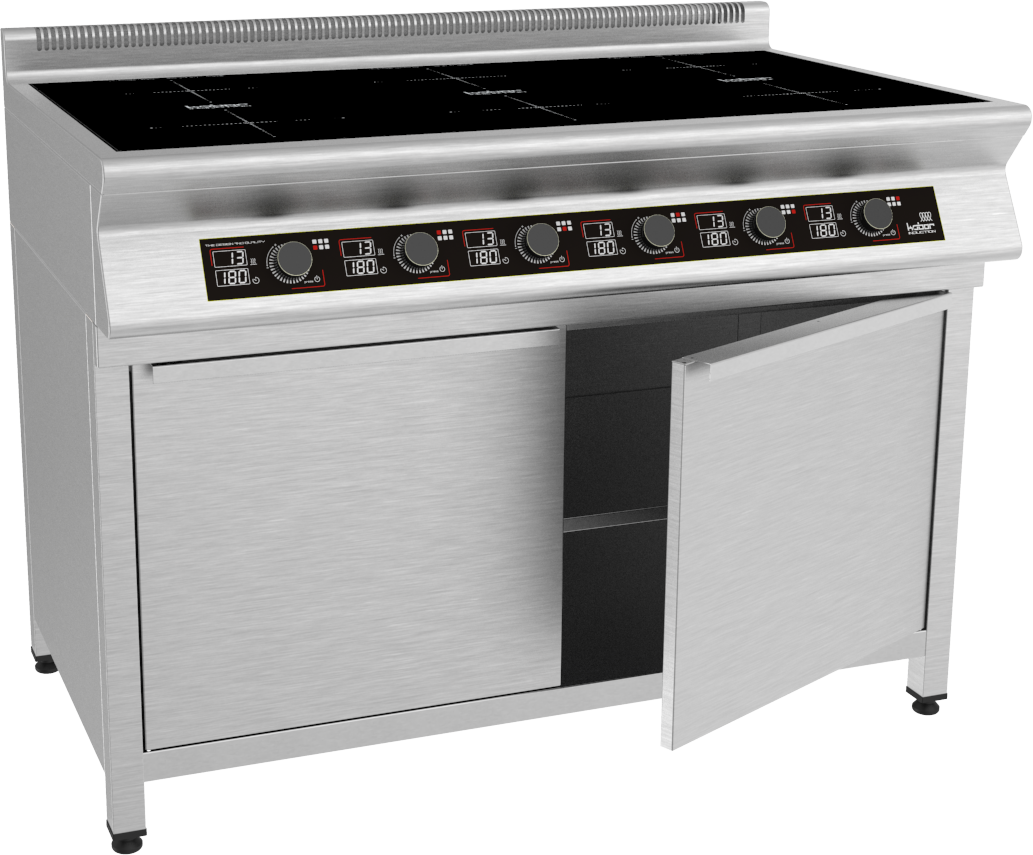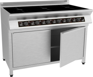 Плита индукционная на тепловой подставке, 6 конфорок мощностью 6х3,5кВт, электронная панель управления с цифровой индикацией, 13 уровней нагрева, таймер до 180мин., корпус плиты из н.с. AISI 304, рабочая поверхность - стеклокерамика 6мм, мощнось подставки 2кВт, перф. полка регулируемая по высоте, электронная реулировка температуры до 60°С, регулируемые по высоте ножки, 23кВт, 380В, вес 136 кг.