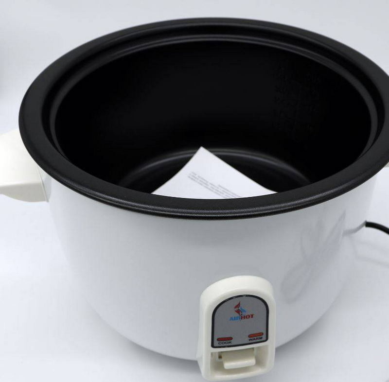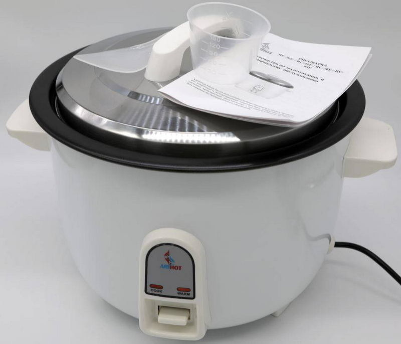 Модель включает съемную чашу с мерной шкалой, которая контролируется термостатом. На панели управления расположены индикаторы «COOK» и «WARM», а в комплект входят совок для риса и мерный стакан.