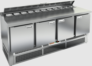 Автоматическая оттайка и электронная панель управления делают эксплуатацию устройства простой и удобной. Стол может вместить 11 контейнеров GN1/6, а размер полки составляет 530х325 мм (GN 1/1). В комплект входят четыре полки, а также предусмотрены: